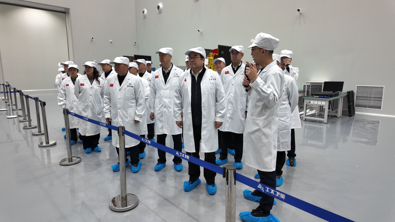 随后,全体人员统一更换工装,进入卫星生产车间实地参观。在王群副总经理的引导下,大家依次观摩卫星总装、测试、环境试验等核心产线,近距离了解卫星从部件组装、系统集成到综合测试的全流程工艺。车间内高效有序的批量化生产模式、先进精密的研制设备与严谨规范的质量管控体系,给参观人员留下深刻印象。
